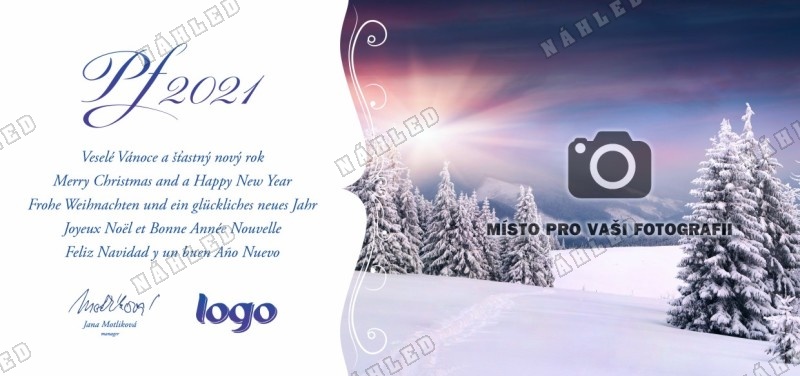 Na tuto novoročenku Vám umístíme váš vlastní motiv (fotografii nebo ilustraci), který přiložíte k objednávce stejným způsobem jako logo. Dodaný obrázek musí mít dostatečné tiskové rozlišení (300dpi). Pokud si nebudete vědět rady, kontaktujte nás.