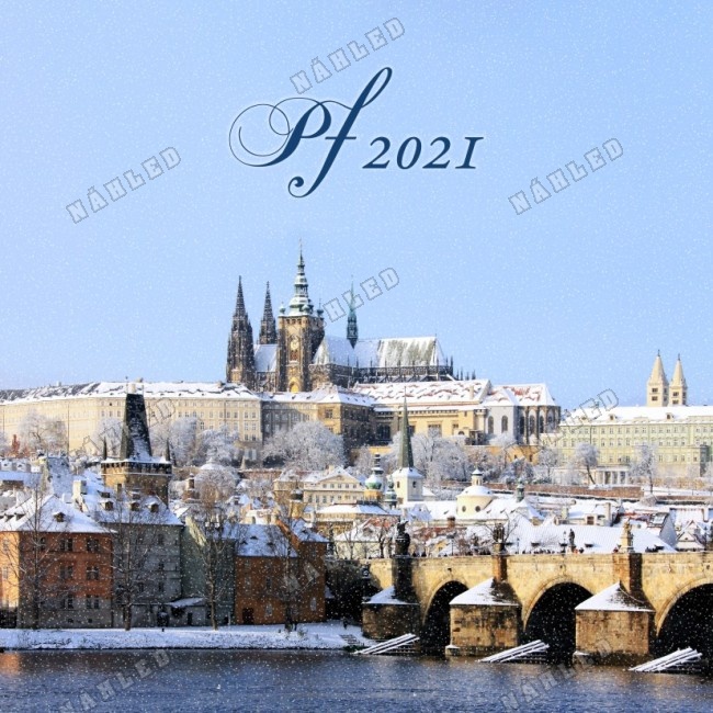 Vánoční přání se zasněženou Prahou s pohledem na Karlův most a Pražský hrad