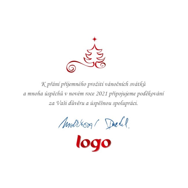 Toto vánoční přání je otevírací ve formě knížky (s textem přání a logo je uvnitř). Přání je do čtvercové obálky. Námi dodávané novoročenky a vánoční přání jsou tištěny na kvalitním 300g křídovém papíře.