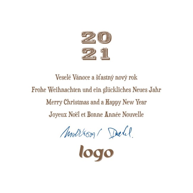 Toto vánoční přání je otevírací ve formě knížky (s textem přání a logo je uvnitř). Přání je do čtvercové obálky. Námi dodávané novoročenky a vánoční přání jsou tištěny na kvalitním 300g křídovém papíře.
