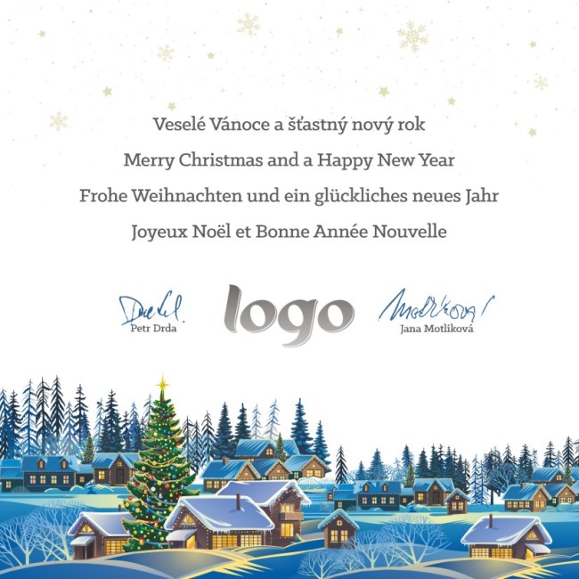 Toto vánoční přání je otevírací ve formě knížky (s textem přání a logo je uvnitř). Přání je do čtvercové obálky. Námi dodávané novoročenky a vánoční přání jsou tištěny na kvalitním 300g křídovém papíře.
