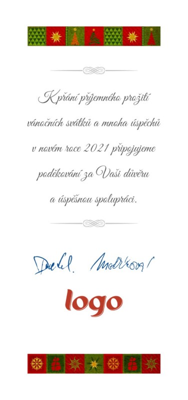 Toto vánoční přání je otevírací ve formě knížky (s textem přání a logo je uvnitř). Přání je do DL obálky. Námi dodávané novoročenky a vánoční přání jsou tištěny na kvalitním 300g křídovém papíře.