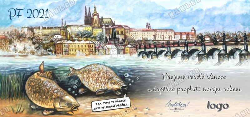 Vánoční přání s kapry a Prahou s pohledem na Hradčany - Karlův most a Pražský hrad