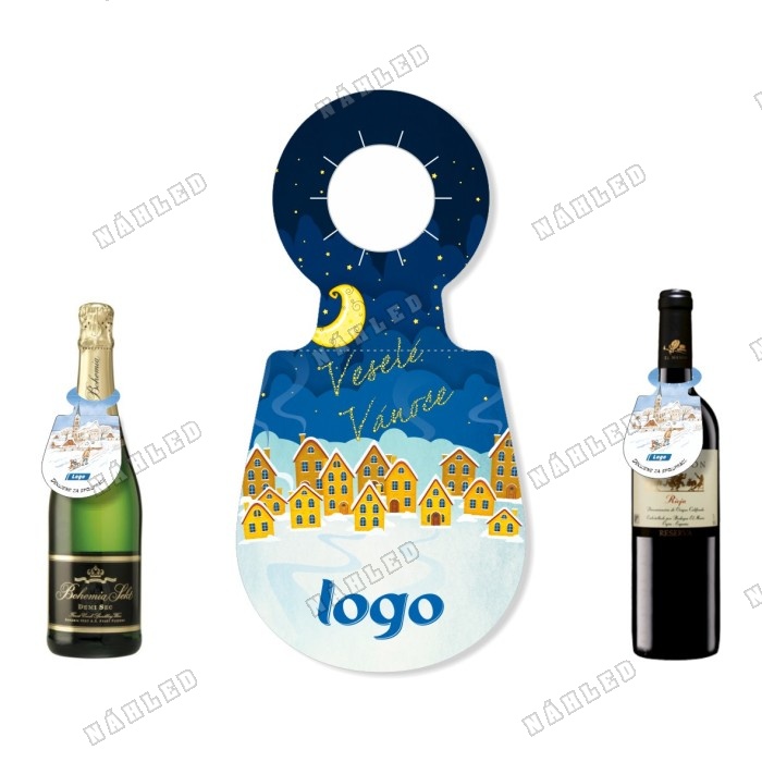 Večerní visačka na lahev s měsícem a hvězdami nad zasněženými chaloupkami
